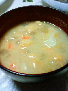 本当は具がごろごろ入った状態で器に盛るんだけど、今の胃の状態を慮って汁多めで。